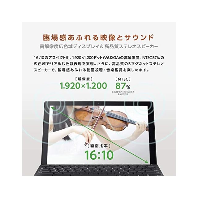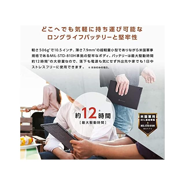 【CPU】MediaTek MT8183【メモリ】4GB【ストレージ】eMMC:128GB【ディスプレイ】10.5型ワイドTFTカラー液晶/グレア/1,920×1200ドット (WUXGA)【インカメラ】192万画素Webカメラ内蔵【アウトカメラ】アウトカメラ 800万画素Webカメラ内蔵 (オートフォーカス対応)