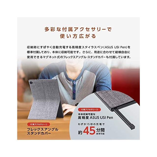 【通信】無線LAN:IEEE802.11a/b/g/n/ac/, Bluetooth 4.2【バッテリー】約12.3時間(本体+キーボード時:約12時間)【消費電力】最大約45W【主な付属品】ACアダプター, 製品マニュアル, 製品書, ASUS USI Pen、デタッチャブルキーボード、フレックスアングルスタンドカバー