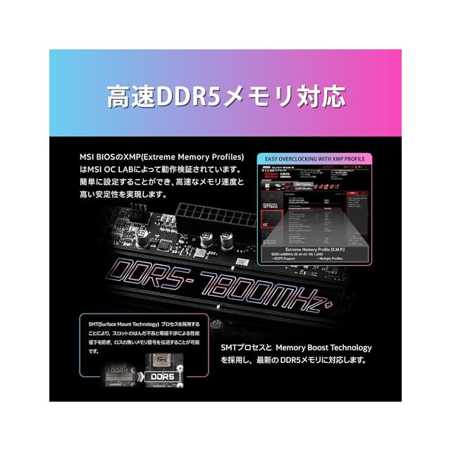 128GB/s転送に対応したPCIE 5.0x16スロットを搭載、信号の干渉や電気ノイズを低減するSMT仕様のスロットに加え、重量のあるグラフィックカードをしっかり支えるmsi STEEL ARMORで高速なグラフィックスをサポートします。