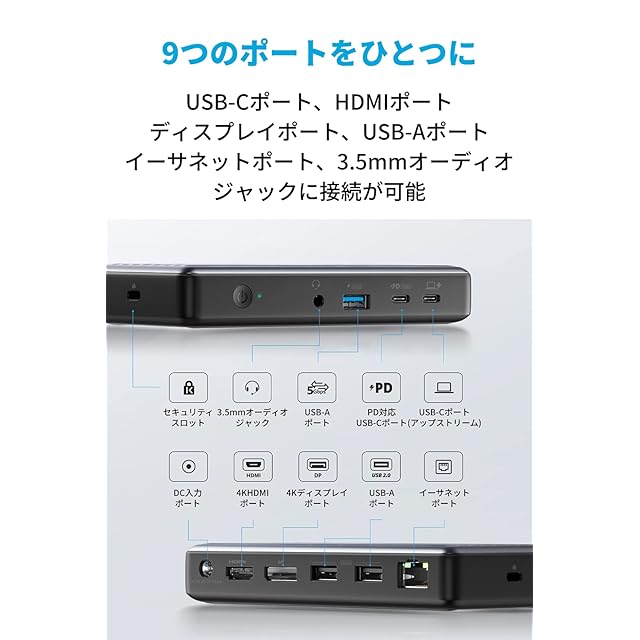 商品名:Anker PowerExpand 9-in-1 USB-C PD Dock ドッキングステーション 60W出力 20W USB Power Delivery/4K対応 HDMI ディスプレイAポート 1Gbps イーサネットポート 3.5mmオーディオジャック搭載