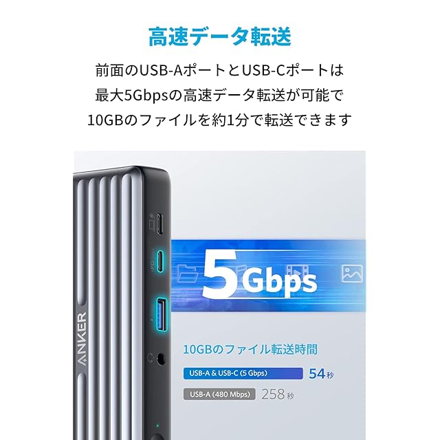 高速データ転送:前面のUSB-AポートとUSB-Cポートはそれぞれ最大5Gbpsの高速データ転送に対応し、動画ファイルや音楽のプレイリストなどを即座に同期することが可能です。