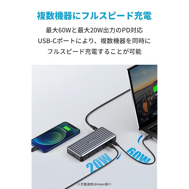 複数機器にパススルー急速充電:最大60W出力のアップストリームUSB-Cポートと最大20W出力のUSB Power Deliveryに対応したUSB-Cポートを搭載し、お使いのノートPCからスマホまで幅広い機器にパススルー急速充電が可能です。(※Anker自社調べ。充電速度はご利用環境によって実際の結果とは異なる場合があります。)