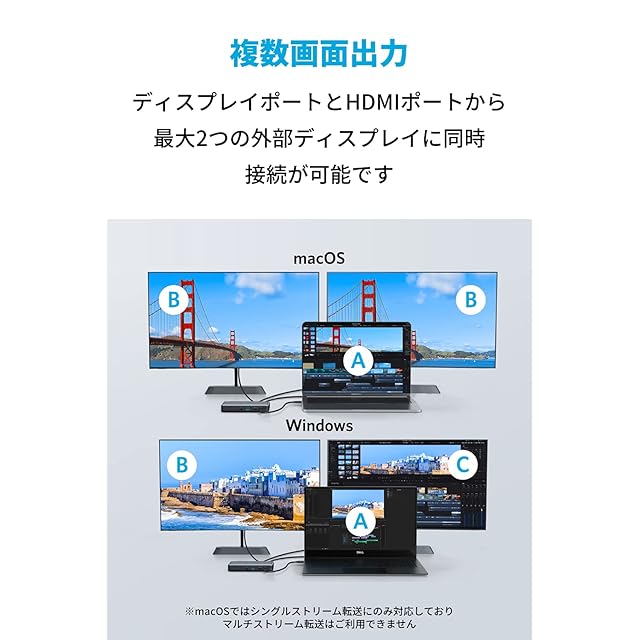 高画質の複数画面出力:HDMIポートとディスプレイポートを経由して同時に2つのディスプレイに接続した場合、最大4K (30Hz) の出力が可能で、高画質なコンテンツを同時にお楽しみいただけます。(※出力条件は本ページ下部にある画像内の「各接続ポートによる最大解像度の対応」をご確認ください。)