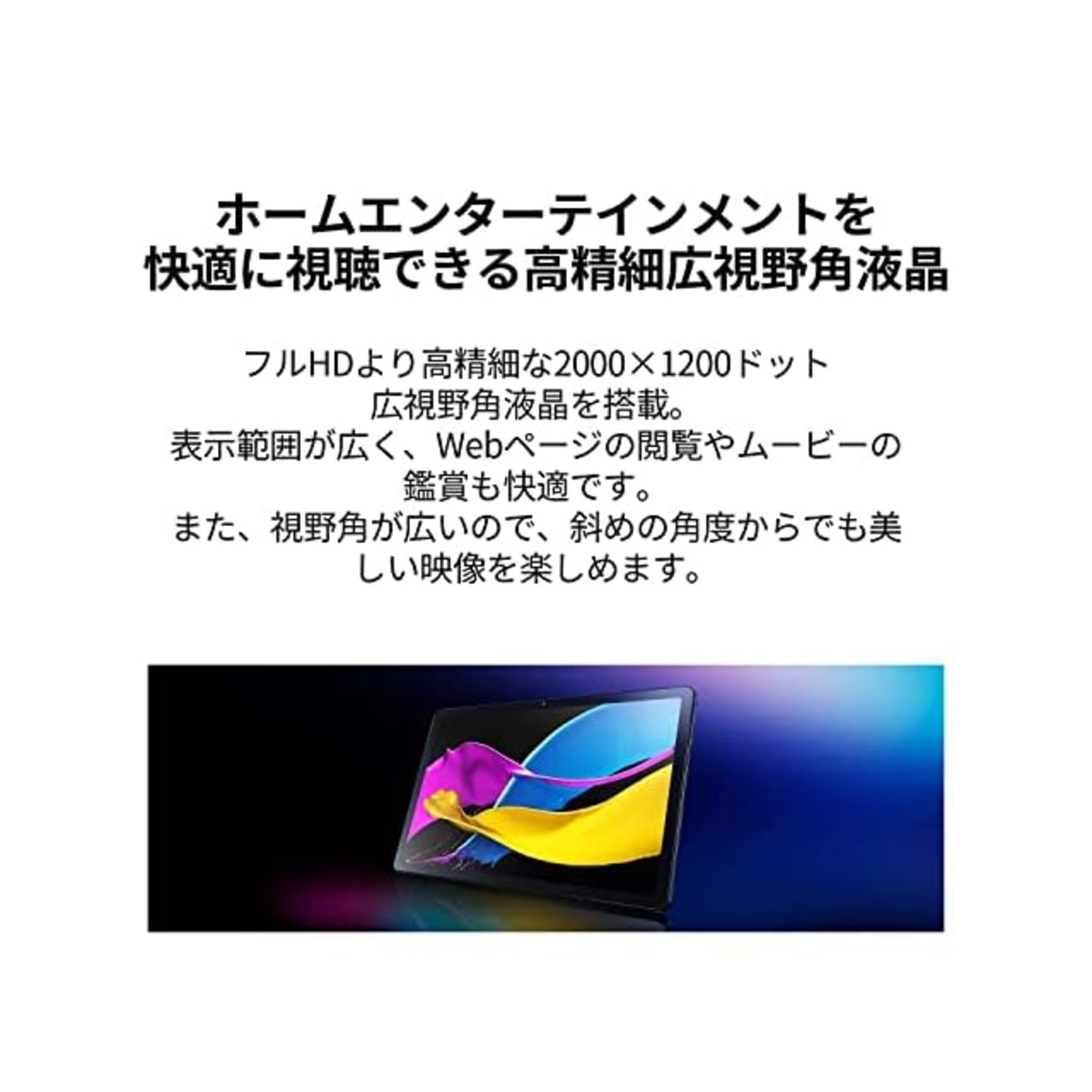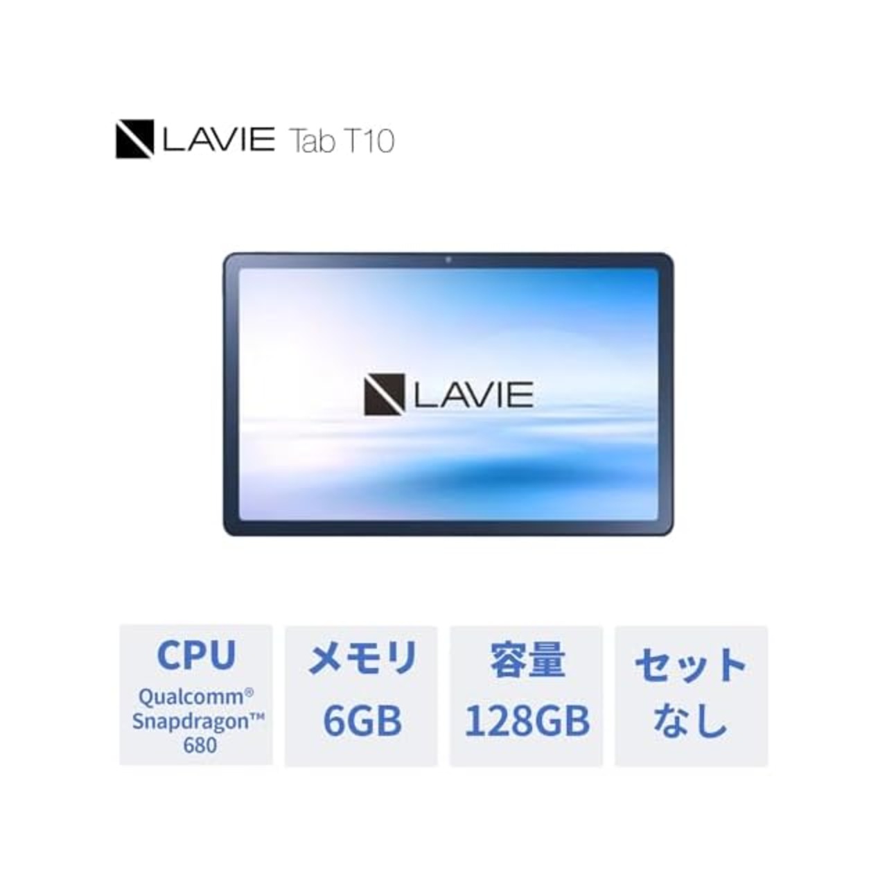 【Android タブレット】 LAVIE Tab T10 (PC-T1075EAS) / 本体寸法:251.2×158.8×7.45mm<br>本体色:ストームグレー<br>本体質量:約470g<br>防水(防滴)/防塵:-/-<br>:1年間<br>通信機能 :無線LAN(IEEE802.11ac/a/b/g/n準拠)、Bluetooth テクノロジー本体内蔵(Ver.5.1)<br>主な添付品:ACアダプタ、充電ケーブル(USB)、マニュアル<br>外部インターフェイス :USB 2.0 Type-C×1(クライアント機能、OTG対応、充電兼用) *2*3、microSDメモリーカード*4<br>メモリ:6GB(LPDDR4X)<br>プロセッサー(CPU):Qualcomm Snapdragon 680 2.4GHz(4コア)+1.9GHz(4コア)(計8コア)<br>プラットフォーム:Android 12*1<br>ディスプレイ:10.61型ワイドLED 広視野角液晶(2000×1200ドット)<br>センサ:GPS、加速度センサ、照度センサ、ジャイロセンサ、Hallセンサ<br>ストレージ:約128GB<br>サウンド機能:Quadスピーカ(Dolby Atmos対応)、モノラルマイク<br>カメラ:[本体前面]有効画素数約800万画素、CMOSカメラ、固定フォーカス[本体背面]有効画素数約800万画素、CMOSカメラ、オートフォーカス<br>LTE/3G (ワイヤレスWAN):-<br>バッテリー駆動:約14時間(Web閲覧時)<br><br>【注意】<br>*1:出荷時期によっては、記載のバージョンよりも新しいバージョンがインストールされている場合があります。<br>*2:すべてのUSB機器の動作をするものではありません。<br>*3:「USB Type-C→3.5mmヘッドフォンジャック変換アダプタ」や「ヘッドフォン」を接続する場合は、DAC内蔵タイプの製品をご利用ください。<br>*4:microSD/microSDHCメモリーカード、本製品でフォーマットしたmicroSDXCメモリーカード(最大128GB)に対応しています。本製品でフォーマットしたmicroSDXCメモリーカードは本製品でのみ使用できます。すべての対応機器との動作をするものではありません。また、著作権保護技術(CPRM)には対応しておりません。