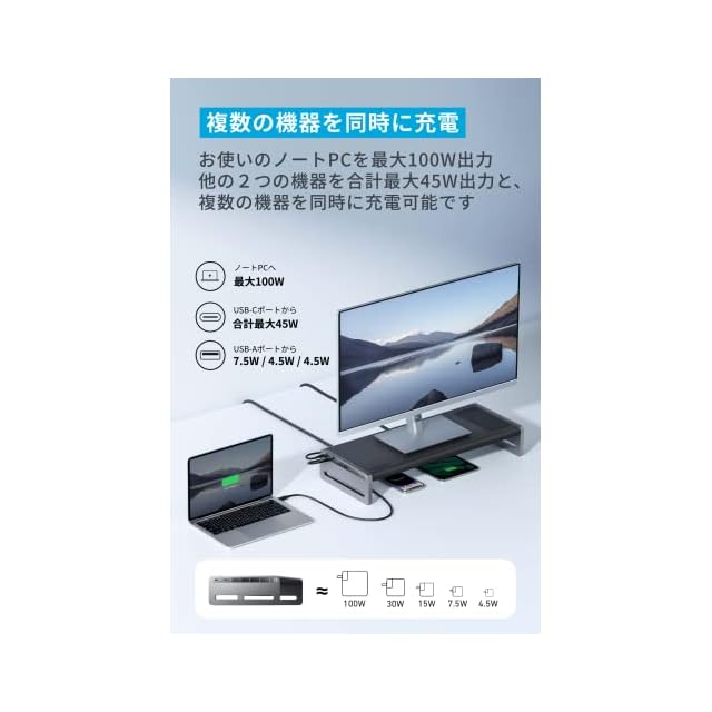 複数の機器を同時に充電:ノートPCを最大100Wで充電可能なUSB-Cアップストリームポートに加え、USB PDに対応したUSB-Cポート (合計45W) 2つ、USB-Aポート (1 × 7.5W, 2 × 4.5W) 3つ、スマートフォン用のワイヤレス充電パッド (最大10W)を搭載しており、複数の機器を同時に充電可能です。