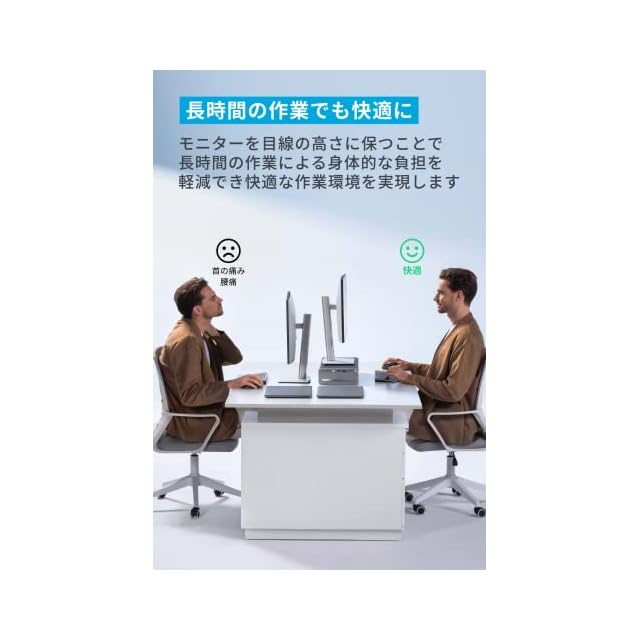 長時間の作業でも快適に:モニターを目線の高さに保つことで長時間の作業による身体的な負担を軽減することができ、快適な作業環境を実現します。