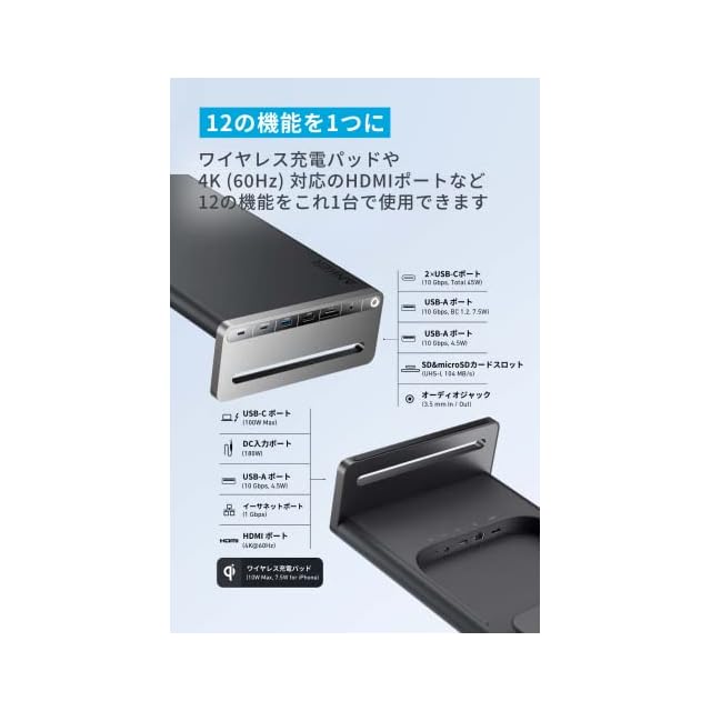 12の機能を1つに:これ一つでケーブルの抜き差しの手間を大幅削減できます。ワイヤレス充電パッド、USB PDに対応した最大100W出力が可能なUSB-Cアップストリームポート、USB 3.2 Gen2 対応のUSB-Cポート (10 Gbps) 2つ、USB 3.2 Gen2 対応のUSB-Aポート (10 Gbps, 7.5W / 4.5W) 3つ、4K (60Hz) 対応のHDMIポート、3.5mmオーディオジャック、イーサネットポート、microSD&SDカードスロットへの接続がこれ1台で可能です。