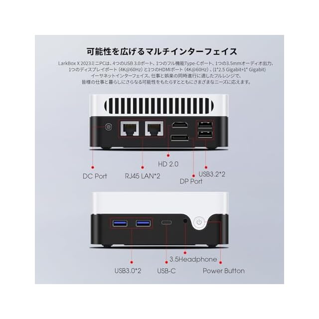 【高速データ転送と多機能ポート】WiFi6(600Mbps)とBT5.2により、簡単な接続が可能であり、高速なデータ転送が実現します。Larkbx X Intel-N100 Mini PCはHDMI、2*USB3.0、2*USB3.2、2*RJ45(1000M*1/ 2.5G*1)、TYPE-C、Displayport、1つの3.5mmオーディオ入力、および1つのDC電源入力を備えています。1000Mブロードバンドで最大128MB/sまでダウンロードスピードをサポートし、オフィスやデザイン、ホームビデオなどのソフトウェアニーズに最適です。