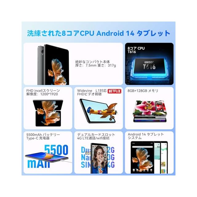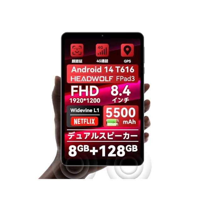 商品名:タブレット 8インチ Headwolf FPad3 タブレット SIMフリー、Widevine L1(Netflix対応)、T616 CPU、1920x1200解像度 FHD IPSスクリーン、8GB(4+4拡張) RAM、128GB ROM、2TB拡張可能、5500mAh、8+13MPカメラ、SIM 4G LTE通信、2.4/5GHz WiFi、BT5.0、顔認識機能付き