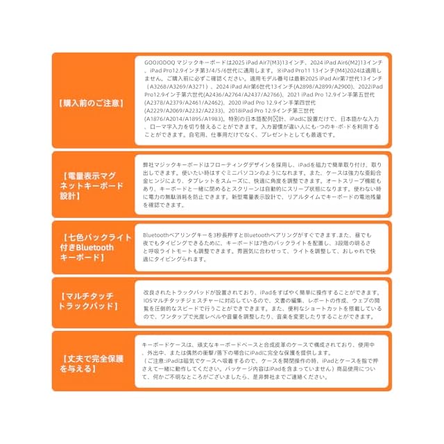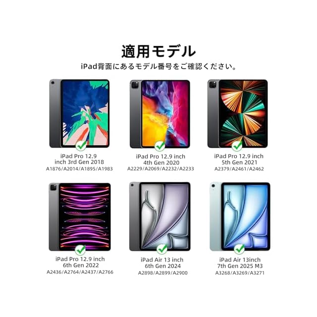 【購入前のご注意】GOOJODOQ マジックキーボードは2024 iPad Air6(M2) 13インチ、iPad Pro12.9インチ第3/4/5/6世代に通用します。※iPad Pro11 13インチ(M4)2024は適用しません。ご購入前に必ずご確認ください。適用モデル番号は最新2024 iPad Air第6世代13インチ(A2903/A2898)、2022 iPad Pro12.9インチ第六世代(A2436/A2764/A2437/A2766)、2021 iPad Pro 12.9インチ第五世代(A2378/A2379/A2461/A2462)、2020 iPad Pro 12.9インチ第四世代(A2229/A2069/A2232/A2233)、2018 iPad Pro 12.9インチ第三世代(A1876/A2014/A1895/A1983)。特別の日本語配列設計、iPadに設置だけで、日本語かな入力、ローマ字入力を切り替えることができます。入力習慣が違い人にも一つのキーボードを利用することができます。自宅用、仕事用だけでなく、プレゼントとしても最適です。