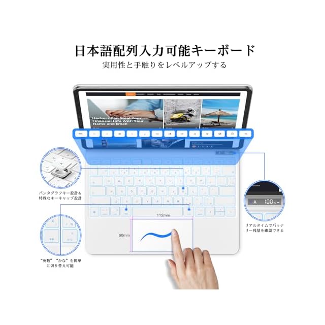 【マルチタッチトラックパッド】改良されたトラックパッドが設置されており、iPadをすばやく簡単に操作することができます。IOSマルチタッチジェスチャーに対応しているので、文書の編集、レポートの作成、ウェブの閲覧を圧倒的なスピードで行うことができできます。また、便利なショートカットを搭載しているので、ワンタップで光度レベルや音量を調整したり、音楽を変更したりすることができます。英数/かな/ローマ字入力をすぐ切り替えることもできます。