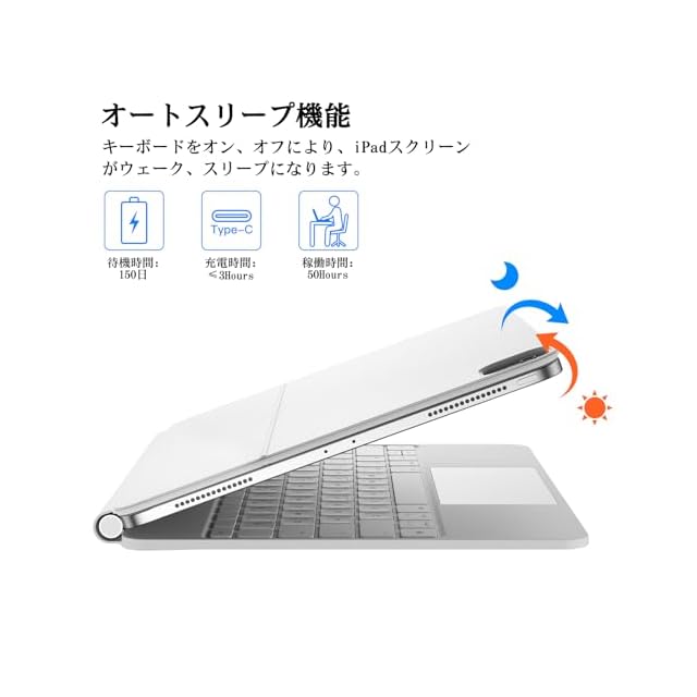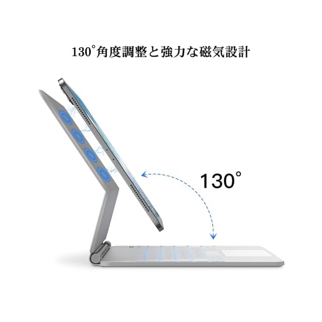 【電量表示マグネットキーボード設計】弊社マジックキーボードはフローティングデザインを採用し、iPadを磁力で簡単取り付け、取り出しできます。使いたい時はすぐミニパソコンのようになれます。また、ケースは強力な亜鉛合金ヒンジにより、タブレットをスムーズに、快適に角度を調整できます。オートスリープ機能もあり、キーボードと一緒に閉めるとスクリーンは自動的にスリープ状態になります。使わない時に電力の無駄消耗を防止できます。新型電量表示設計で、リアルタイムでキーボードの電池残量を確認できます。