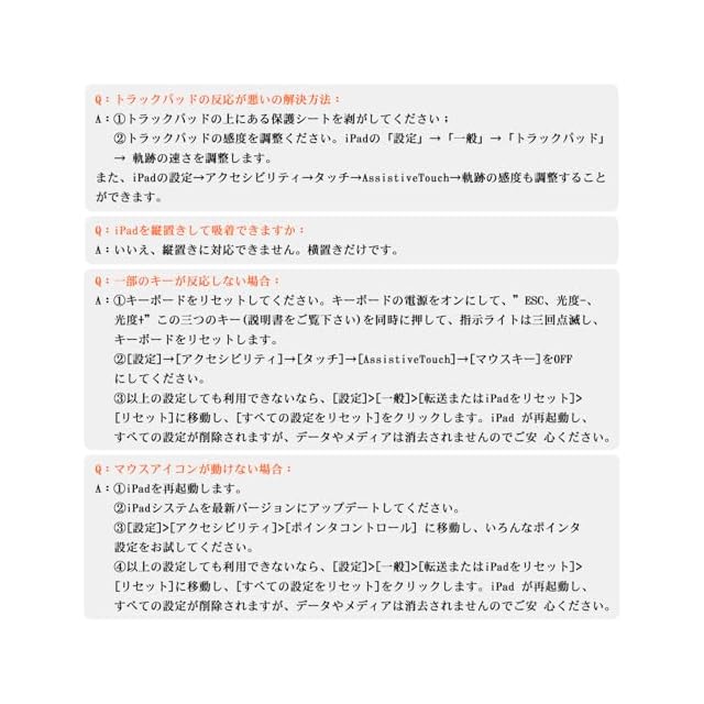 【技適認証済み&丈夫で完全保護を与える】技術基準適合証明認証済みマジックキーボードなので、商品の安 全性をできます。キーボードケースは、頑丈なキーボードベースと合成皮革のケースで構成されており、使用中、外出中、または偶然の衝撃/落下の場合にiPadに完全な保護を提供します。(ご注意:iPadは磁気でケースへ吸着するので、ケースを開閉操作の時、iPadとケースを指で押さえて一緒に動作してください。※ご注意:所属品の中に日本語説明書がない場合は是非弊社までご連絡ください。
