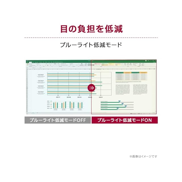 目への負担を軽減する「フリッカーセーフ」や「ブルーライト低減モード」も搭載。