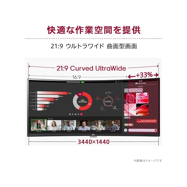 通常のモニターより133%横に長い画面と、3440×1440の高解像度が効率的な作業領域を提供するウルトラワイドモニター。