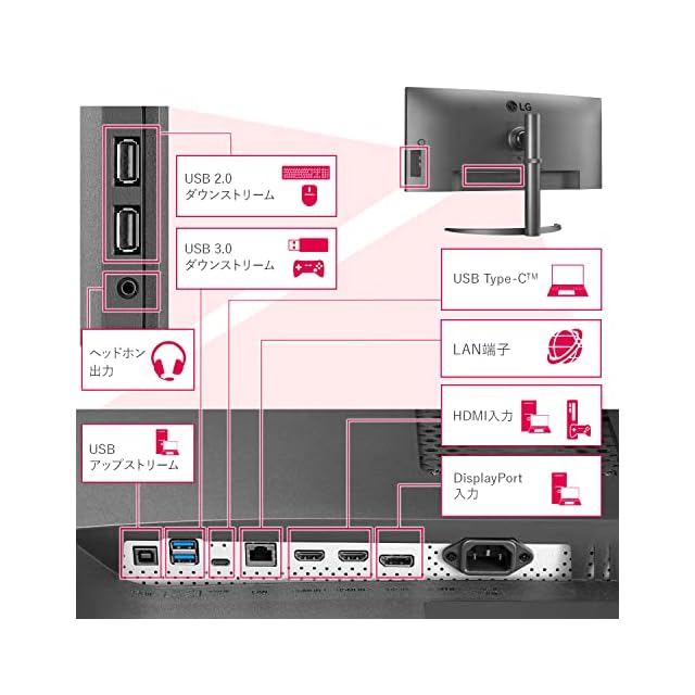 KVMスイッチを内蔵。PC1台をUSB Type-Cに接続し、もう1台のPCを映像入力端子(HDMI、DisplayPort)とUSBアップストリーム端子(USB2.0)に接続すれば、モニターのダウンストリーム端子に接続したUSBデバイス(キーボードやマウス、USBストレージなど)やネットワーク通信、音声(内蔵スピーカーまたはヘッドホン端子に接続したオーディオ機器)、画面(PBPにも対応)を2台のPCで共有可能。