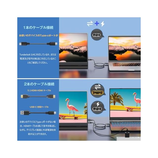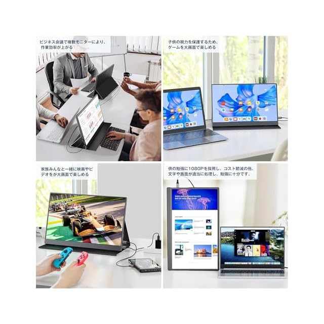 【ケーブル1本映像出力と電源供給・幅広く機種に対応】Type-Cケーブルを経由で接続対応のPCやスマホなど、映像出力と電源供給を1本のケーブルで行うことができます。((Thunder 3/4 以上のType-cでないと、電源ケーブルも接続してください)。接続がすごく簡単なので、いつでもどこでもYouTubeやゲーム・映像を楽しめて、ビジネスではweb会議やプレゼンテーションにも使えます。ノードPC、デスクトップ、スマートフォン、PS4/PS5、XBOXやSwitch、Macbook、MacMini、Ipad(Type-Cポートモード搭載)など、幅広いデバイスに対応しています。パネル拡張モードやコピーモードに対応し、横型ディスプレイを簡単に設置することができ、仕事の相談やプレゼン、ゲームや映画を楽しむなど、いつでも気軽に利用することができます。