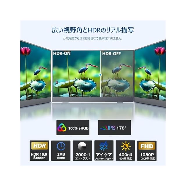 ご注意:一部電源アタプタは捆包のために初期不良可能性があり、点滅や電源入らない場合が、アフターサービスまでご連絡ください。【IPSパネル搭載・フルHDに対応】モバイルモニタは可視性に優れたIPS液晶パネルを採用されるため、 画質・発色が共に高品質なIPSパネルを採用し、屋内外での視認性を確保される。178度の広視野角は、見る位置や角度による歪みや色ずれを最小限に抑え、どの角度から見ても美しい映像をお楽しみいただけます。解像度は1920 X 1080でフルHDに対応でき、HDR(ハイダイナミックレンジ)に対応しており、白飛びや黒潰れの少ない美しい映像を楽しめます。