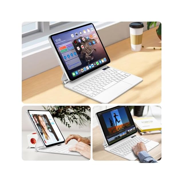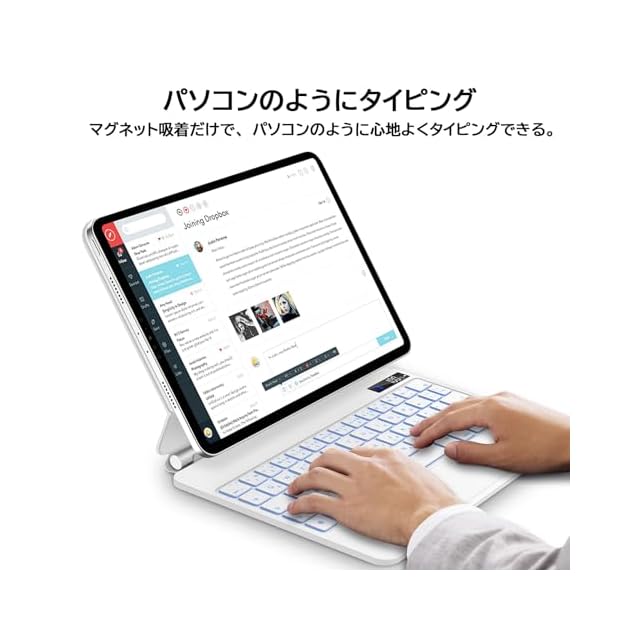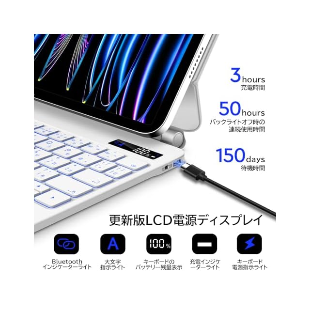 【電量表示マグネットキーボード設計】弊社マジックキーボードはフローティングデザインを採用し、iPadを磁力で簡単取り付け、取り出しできます。使いたい時はすぐミニパソコンのようになれます。また、ケースは強力な亜鉛合金ヒンジにより、タブレットをスムーズに、快適に角度を調整できます。オートスリープ機能もあり、キーボードと一緒に閉めるとスクリーンは自動的にスリープ状態になります。使わない時に電力の無駄消耗を防止できます。新型電量表示設計で、リアルタイムでキーボードの電池残量を確認できます。