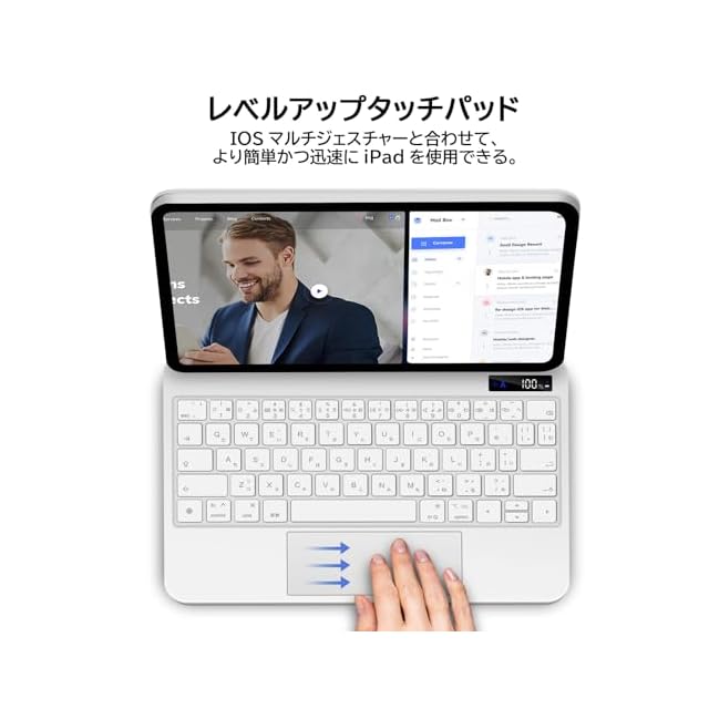 【マルチタッチトラックパッド】改良されたトラックパッドが設置されており、iPadをすばやく簡単に操作することができます。IOSマルチタッチジェスチャーに対応しているので、文書の編集、レポートの作成、ウェブの閲覧を圧倒的なスピードで行うことができできます。また、便利なショートカットを搭載しているので、ワンタップで光度レベルや音量を調整したり、音楽を変更したりすることができます。