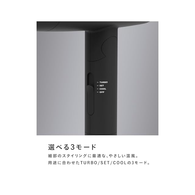 【シンプルな3モードで、シンプルヘアセットを】TURBO、SET、COOLの3モードを搭載。お風呂上がりにはTURBO、朝のブローにはSET、スタイリングのキープにはCOOLと、用途に応じた使い分けができます。