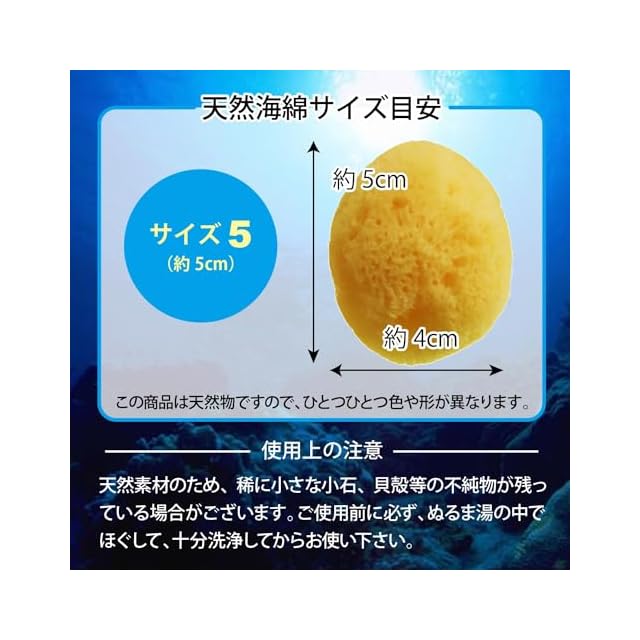 この商品は天然物ですので、ひとつひとつ色や形が異なります。天然素材のため、稀に小さな小石、貝殻等の不純物が残っている場合がございます。ご使用前に必ず、ぬるま湯の中でほぐして、十分洗浄してからお使い下さい。熱いお湯(50度以上)は、海綿が傷む場合もございますのでご注意下さい。入荷時期によって、大きさが多少異なる場合がございます。