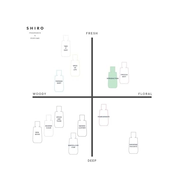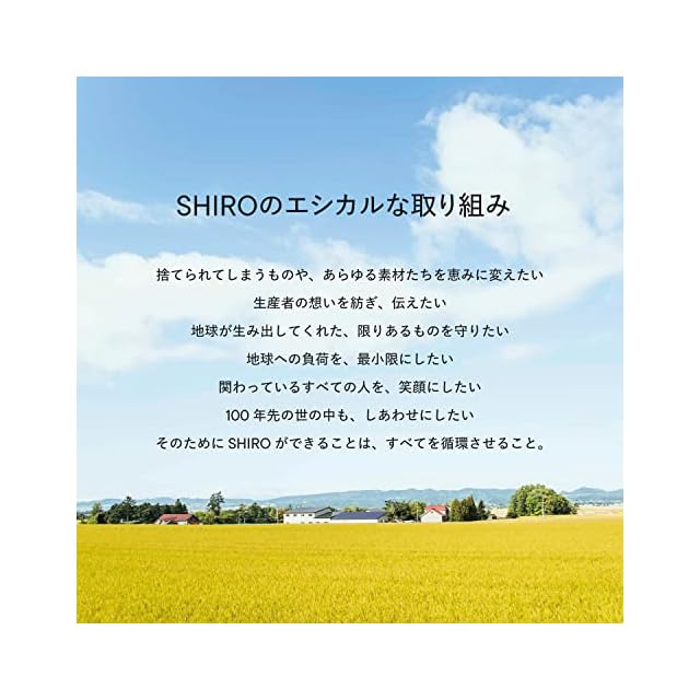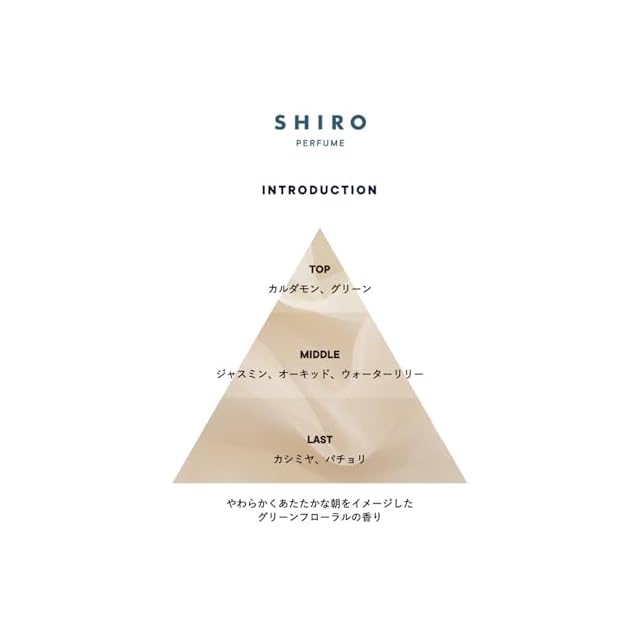 【喜びあふれる上品で可憐な花畑をイメージした香り】 ヒヤシンスやミュゲ、ジャスミンなどの幸福感をもたらすフローラルブーケを中心に、爽やかな柑橘とフレッシュなアプリコットが上品に重なっていきます。華やかなだけじゃないのは、ムスクやアンバーが落ち着いた印象を与えていくから。 日常の中で見つけた喜びや楽しさは、なんだか輝いて見える特別なものです。胸のときめきも、香りも、大切な人と分かち合ってみてください。 テーマやコンセプトを設けず、世界各地のパフューマーが自身のアイデンティティと向き合い、その世界観を自由に表現することで、生み出された心を魅了する香り「SHIRO PERFUME」。 水の代わりに配合したSHIROのスキンケア製品などにも使用している、徳島県の木頭ゆず*1が香りをより魅力的なものに仕上げてくれます。 <香りの持続時間>約5~6時間 *1 ユズ果皮水 / 保湿・芳香成分