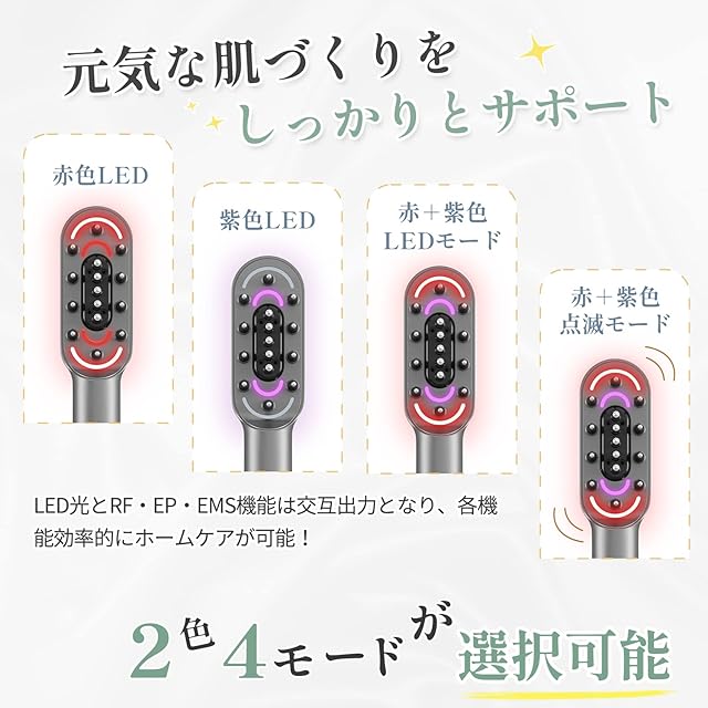 【赤&紫のLED光エステで肌を整える】赤色LED(630nm)と紫色LED(400nm)を搭載し、お肌の悩みに合わせて4つのモードを選択可能。毎日のケアで化粧ノリや肌の明るさ、ツヤの違いを実感できる。ボタンひとつのシンプル操作で、美顔器初心者の方でも安心して使える。