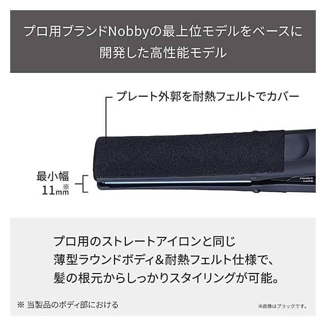 最薄部たった11mm※1。プロ用ストレートアイロンと同じ薄型ヘッドを実現。髪の根元のクセまで、しっかりストレート。プレート外部は耐熱フェルトでカバーし、火傷のリスクを低減します。※1 当製品のボディ部において