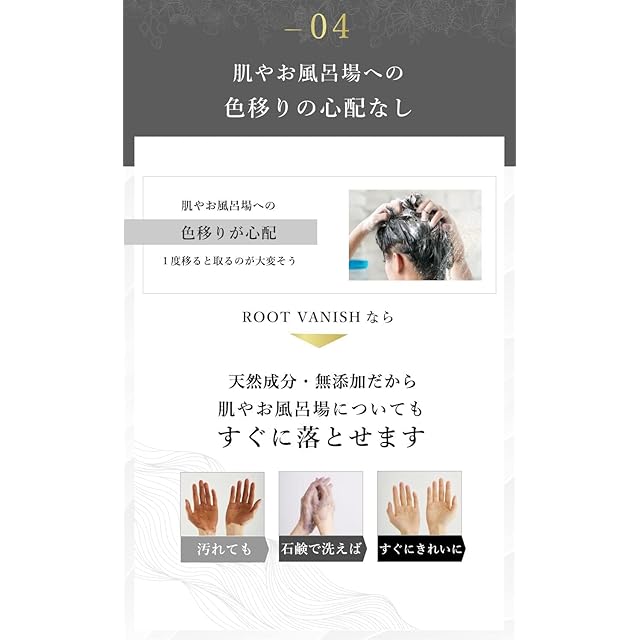 ✅【洗いながら染める】自然な仕上がりで白髪を目立たなくし、使うほどに髪をケアし補修してツヤと潤いが増していきます。天然成分・無添加だから肌やお風呂場についても石鹸で洗えばすぐに落とせます。