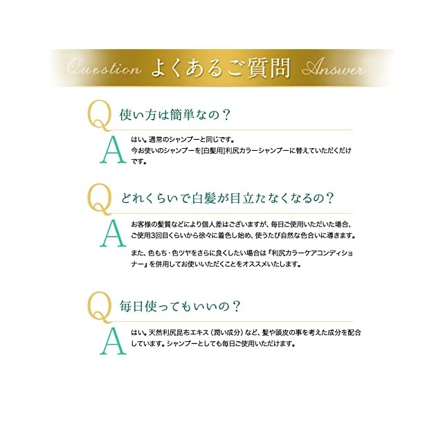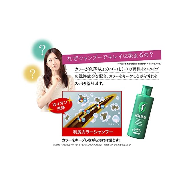 利尻カラーシャンプーは、「洗う」と「白髪ケア」が同時に行える『Wイオン洗浄』。 カラーが落ちにくい(+)と(-)の両性イオンタイプのケア成分を配合で、汚れはしっかり落としながらカラーはキープします。