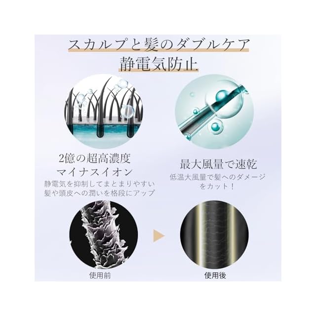 【髪のダメージを最小限に!静電気防止!】 2億の超高濃度マイナスイオンで従来のドライヤーより、髪の毛や頭皮の保水力を格段にアップさせて、キューティクルの傷みも静電気も抑えられます。ドライヤーの最大風量でスカルプや毛髪にやさしいし、速乾性を極めたため、熱を受ける時間が短くして、髪へのダメージも最小限に抑えて、ドライヤーは毎日使い続けることで髪や頭皮をケアしてくれるのは特徴です。
