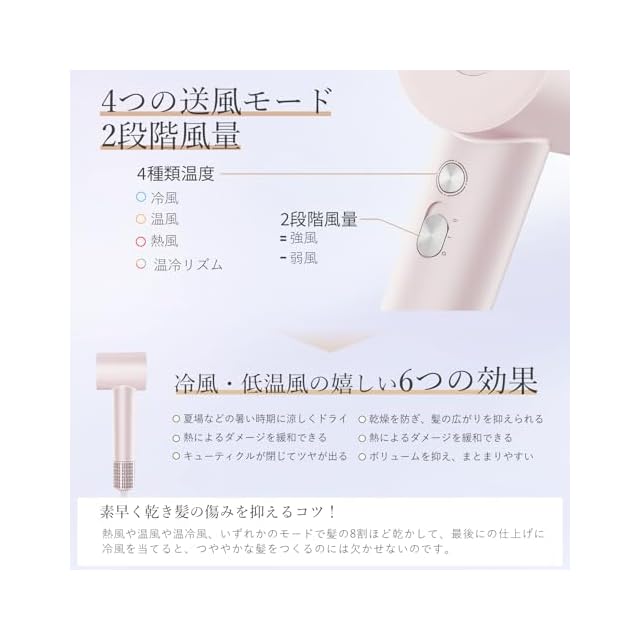 【4つのモード×風量2段階調節】 温冷リズムモード、冷風、温風、熱風4つのモード搭載で風量も2段階調節できて、酷暑の夏でも、乾燥しがちな冬でも、オールシーズン快適にお使いいただけます。温冷リズムモードは温風と冷風を交互に繰り返して、タンパク質の熱変性は避けながら艶やかでまとまりのある髪へ!朝の時短ヘアケアしたい人とドライ後の髪のパサつきが気になる人にぜひおすすめです。