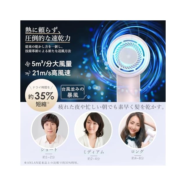 【ダブルケアドライヤーについて】ドライヤー業界の技術は日々変化しており、ANLANも家電に力を入れ、独自のデザイン性と技術力を備えた、革新的な速乾ドライヤーを開発するに至りました。『髪を守りながら速く乾かすという技術』にたどり着き、そこにマイナスイオン発生を加えることで、速乾と同時に美髪までも実現可能となりました。
