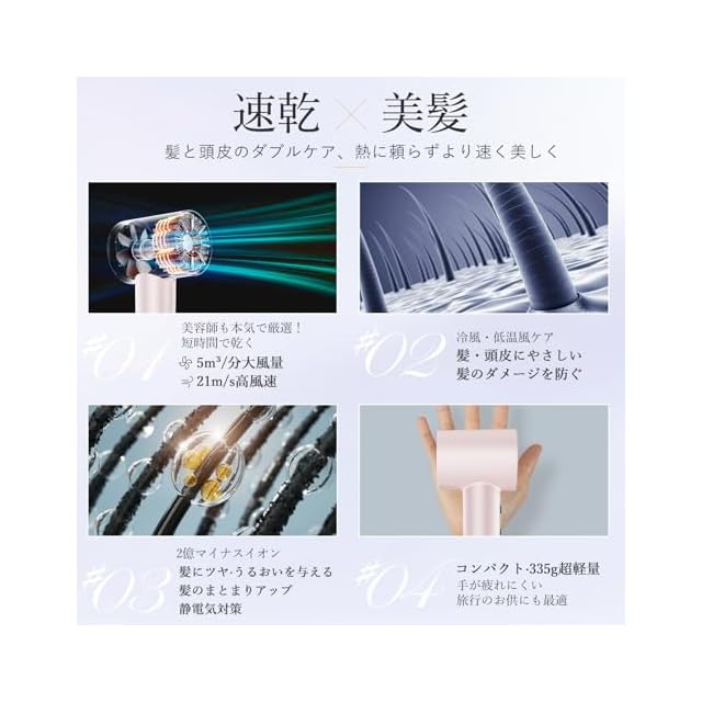 【5m³/分大風量×21m/s高風速】熱に頼らず“速乾力”に工夫を凝らして、従来の乾かし方を一新し、技術革新による新たな送風方法で、5m³/分の大風量と最大21m/s台風並みの大風速による、髪と頭皮を守りながら速乾を実現できるヘアドライヤー。
