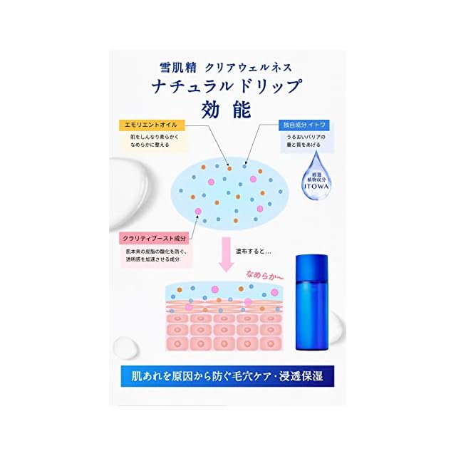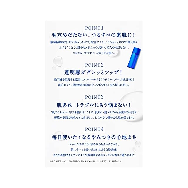 肌に吸い込まれるような浸透感で、たっぷりのうるおいで満たしながら肌表面はべたつかず、毛穴の目立ちにくい、すべすべなめらかな肌にととのえます。