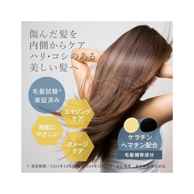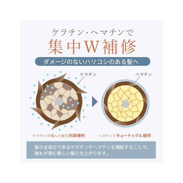 【ケラチン・ヘマチンで艶髪へ】髪の主成分ケラチンを与え、傷んだ髪を内部補修。ヘマチンがケラチンと結合することでハリ・コシのあるダメージレスな髪に。