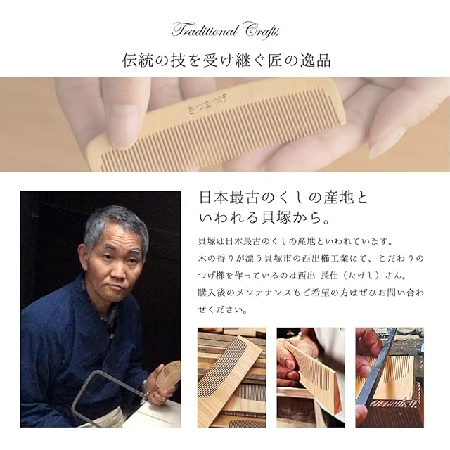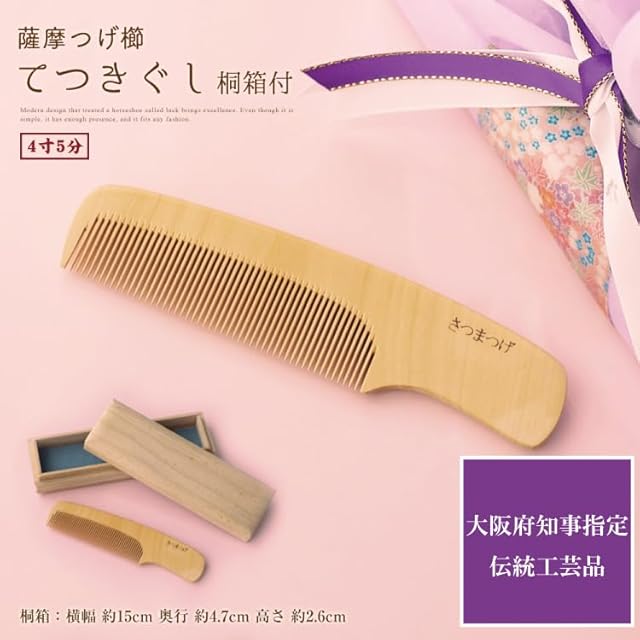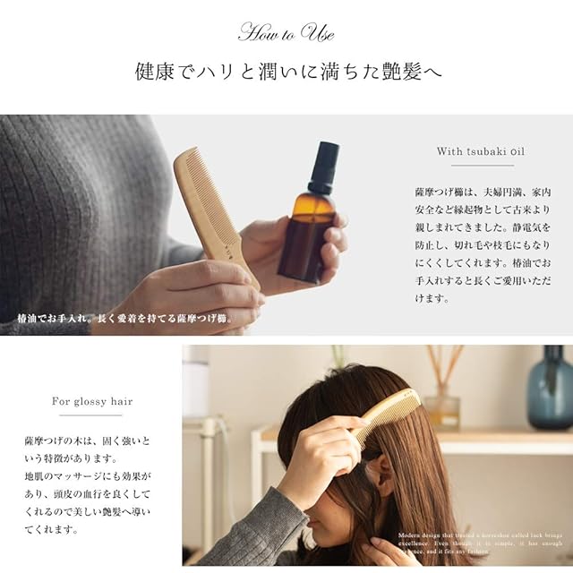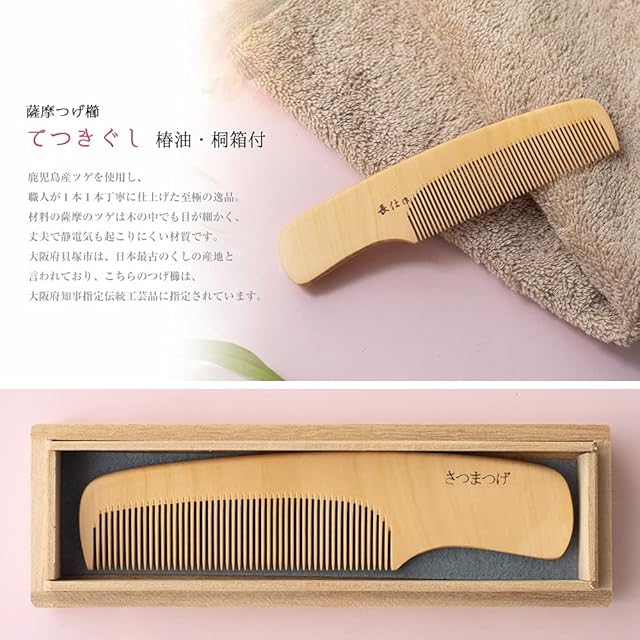 【つげ櫛と椿油のセット商品です】鹿児島産柘植(つげ)を使用し、職人が1本1本丁寧に仕上げた至極の逸品。こちらのつげ櫛は、【大阪府知事指定伝統工芸品】に指定されています。