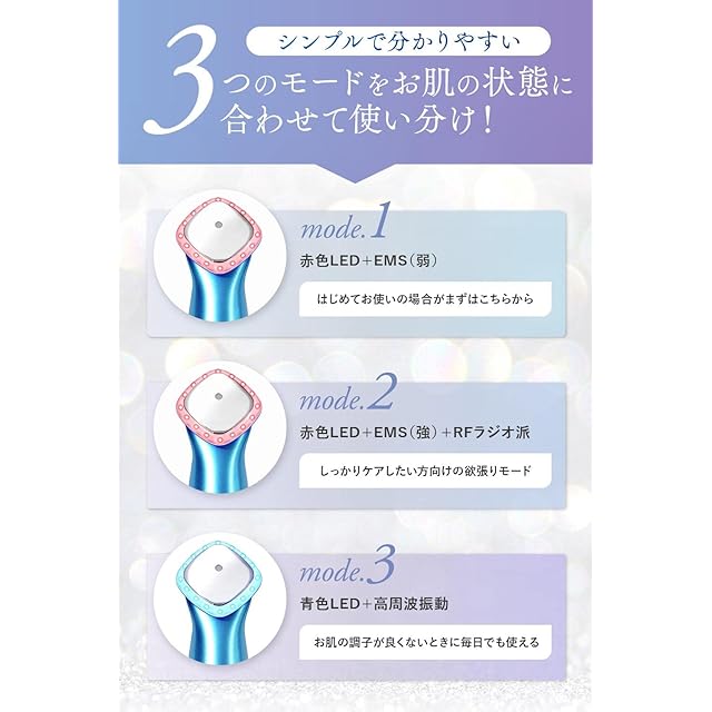 【イオン導入】美容液などのエッセンスに含まれる美容成分をお肌に浸透させます。【EMS】微弱電流により、フェイスラインのトレーニングをサポートします。弱モードと強モードの2段階を搭載しているので、お肌の状態やお好みによって使い分けることが可能です。【RFラジオ派】温熱ケアで毛穴を開き、汚れや黒ずみなどを簡単に取り除くだけではなく、美容成分もお肌のすみずみまでに浸透しやすくなります。