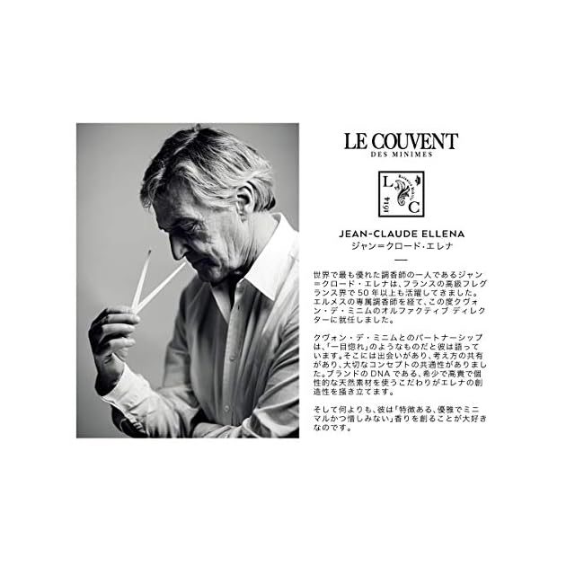 50年以上にわたってフランスのフレグランス界で活躍、世界で最も偉大な調香師の一人とされるジャン=クロードエレナの指揮のもと、ル クヴォン メゾン ド パルファムは、高貴で希少なナチュラルな素材を使用し、ユニークでラグジュアリーかつ親しみやすい、現代的な香りを創りだしています。植物のエッセンスとナチュラルな素材を優先して使用し、硫酸塩、パラベン、シリコンは含まれておらず、すべての製品がイギリスのヴィーガン協会の認証*を取得しています。