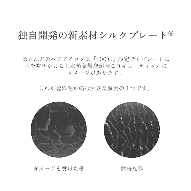 【新常識シルクプレートで真のツヤ髪を】200℃で⽔分を吹きかけても瞬間蒸発をせず、髪の⽔分を守ることができます。滑りが良く、髪のひっかかりが少ないため、髪への負担軽減。