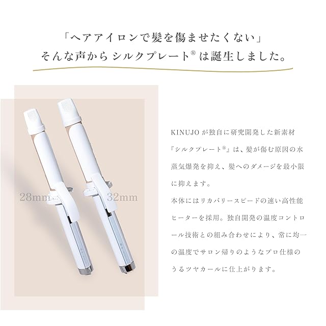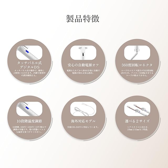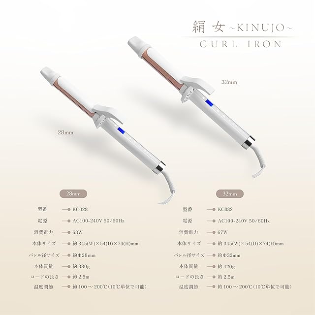 【設計】リアルタイム温度表⽰機能。⾃動電源OFF機能搭載(60min)。選べる2つのバレルサイズ(28㎜、32㎜)独⾃の技術でカールアイロン業界No.1の温度上昇スピード