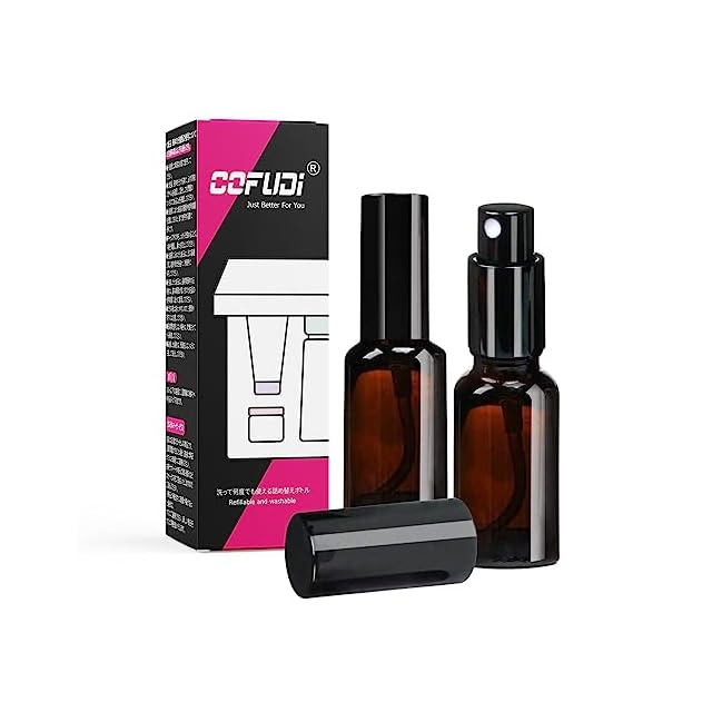 [容量]:30ml*2個 セットスプレータイプの遮光瓶。ボトルカラー アンバー(茶色) / ノズルカラーブラック 、ノズルには埃を防ぐための黒いダストキャップが付いています。幅33mm X高さ107mm。