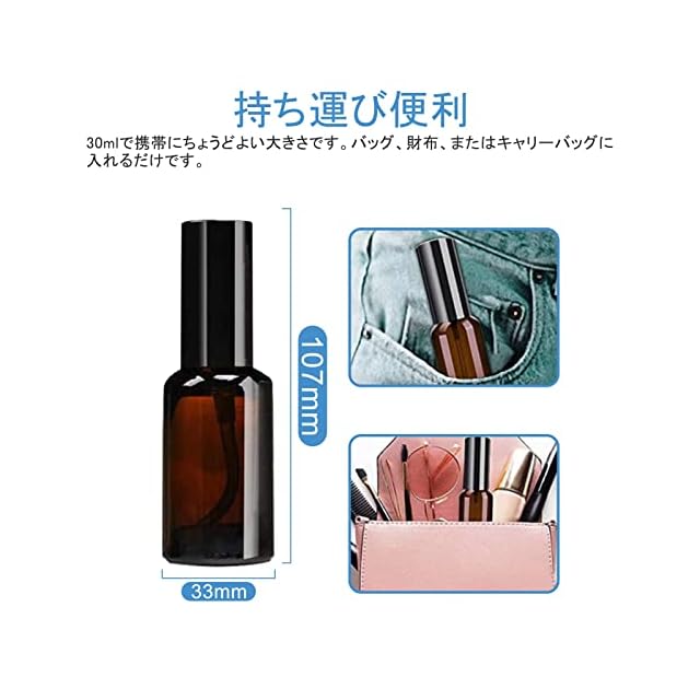 [容量]:30ml*6個 セットスプレータイプの遮光瓶。ボトルカラー アンバー(茶色) / ノズルカラーブラック 、ノズルには埃を防ぐための黒いダストキャップが付いています。幅33mm X高さ107mm。