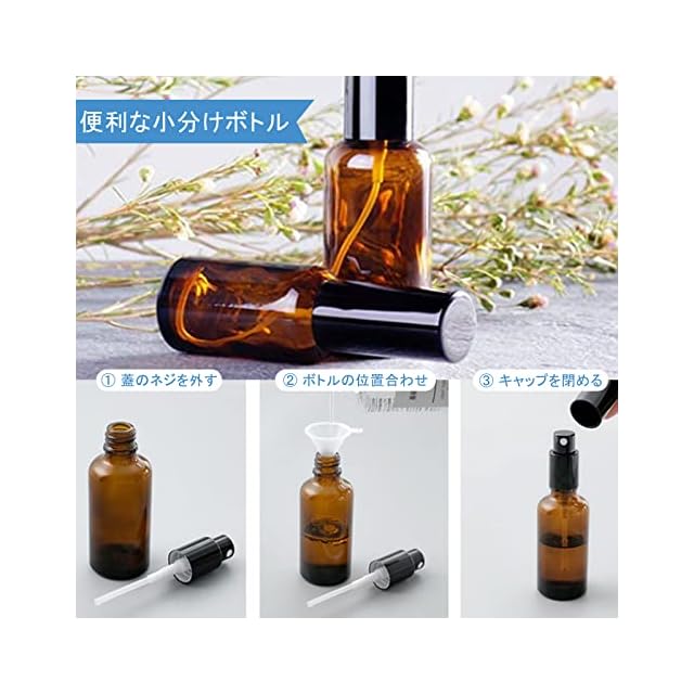 [容量]:30ml*20個 セットスプレータイプの遮光瓶。ボトルカラー アンバー(茶色) / ノズルカラーブラック 、ノズルには埃を防ぐための黒いダストキャップが付いています。幅33mm X高さ107mm。