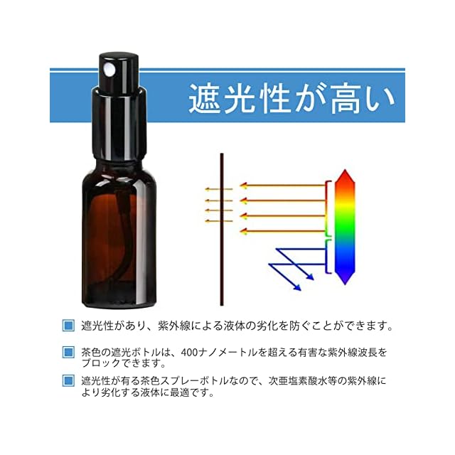 [材質]:ガラス製のブラウンのスプレー容器は、透明なガラス瓶よりも遮光性が高く、ほとんどの紫外線やまぶしさをカットし、紫外線による劣化を防ぐ茶色のスプレー容器です。光に弱い液体を保存しやすく、液体の劣化を防ぐことができます。