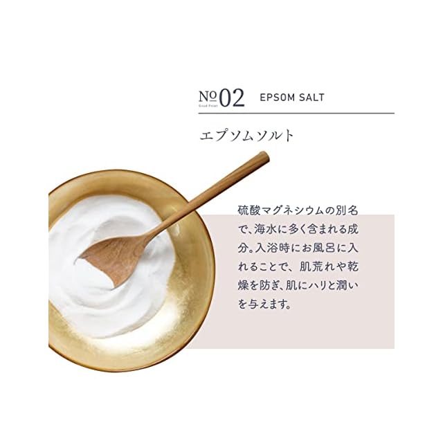 【エプソムソルトとは】塩ではなく硫酸マグネシウムの名称で、海水に多く含まれている成分です。マグネシウムは身体の中で作ることができないため、毎日取り入れることはとても大切。毎日の入浴に入れて取り込むことで、お肌を健やかにします。