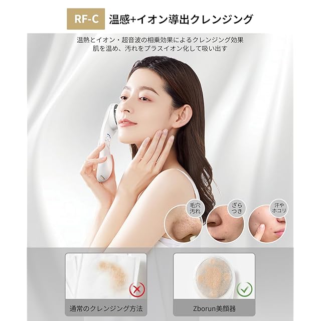 【多機能美顔器・自宅で本格エステ】Zborun温冷美顔器は日本人の肌トラブルに対応して開発!RF機能、EMS微電流などのテクノロジーを搭載して、表情筋にアプローチして、フェイスラインをスッキリと。また、赤/青/黄3つのLEDを組み合わせて、クリーニング、イオン導出、イオン導入、リフトアップ、目元ケア、温熱、振動の機能があります。革新的なフラットヘッドは高いエネルギー効率を持ち、様々なお肌に対応して全面的に集中ケア、美容院と同じ効果を家庭で実現できます。