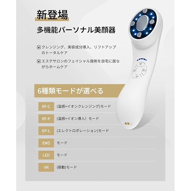 【6種類モード・5段階調整】①CLEANSモード:コットンリングで化粧水を含めるコットを固定して使用して、イオンクレンジングと振動で、お肌の深部まで温めながら、古い角質や毛穴汚れを取り除きます。②PERMEATIONモード:イオン導入技術では肌への角質層すみずみまで、より速く皮膚に吸収されるのを助け、高浸透率で肌のうるおいを与え、手塗のほうより効果倍増。③LIFTINGモード:電気刺激を筋肉に与え、微弱電流が肌に深く作用し、表情筋を動かすことによって、肌を引き締め、たるみを解消します。顔の調子に合わせて5段階調整できます。④RESTOREモード:RF射频モードは200万Hzに達する高周波を照射できるため、肌の奥まで届いて、細胞を刺激し、コラーゲンの生成を手助けしてくれます。⑤EYESモード:アイクリームの吸収率をアップするだけでなく、キュッとした目元や、ハリツヤ感のあるお肌へと導きます。⑥COOLモード:12-16℃冷感ケアもでき、冷やすことでハリとキメの整ったお肌に導きます。各モードには5段階の調整があり、さまざまな肌質の人々に対応します。多機能を一台に総合し、毎日のケアを新感覚で!