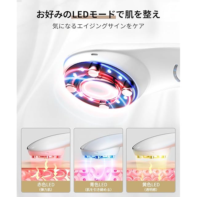 【本格的な光エステ・EP-L技術・VR振動】多機能美顔器は3種類の光波がついており、赤色LEDモード、青色LEDモード、黄色LEDモード、赤.青.黄LED繰返しモードです。お肌の状態により相応しいLEDモードをお選びいただけ、ハリツヤのあるモテ肌に導く、肌の透明感を高めます。EP-Lモードは電気パルスで表皮細胞に電子孔を形成し、有効美容成分を皮膚の深部まで浸透させます。VR振動は、肌の血行を促し健康的な自然な肌つくりに導きます。